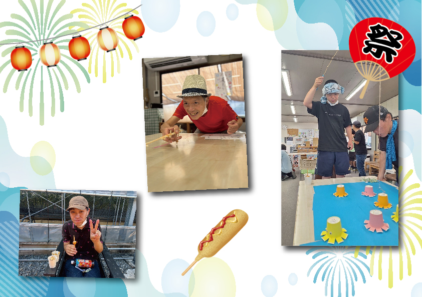 7月のイベント「夏祭り」 去年も行った夏祭りを、今年も開催しました!! 室内レクレーションは、魚釣りゲームと射的。 食べ物は、アメリカンドック、ドーナツ、ポテトフライがありました。 ポテトフライに使用したジャガイモは、マ