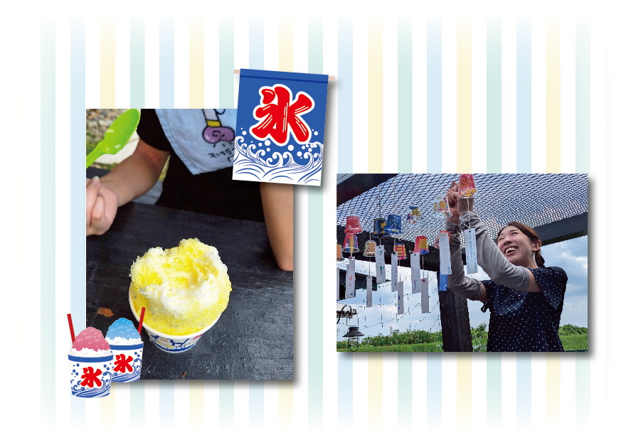 8月のイベント「かき氷」 今年は少しバージョンアップした、かき氷「白くま」を作って食べました! 製作は風鈴づくりをしました。透明のコップにアクリル絵の具で描いていきます。 お庭が、涼し気な雰囲気になりました。